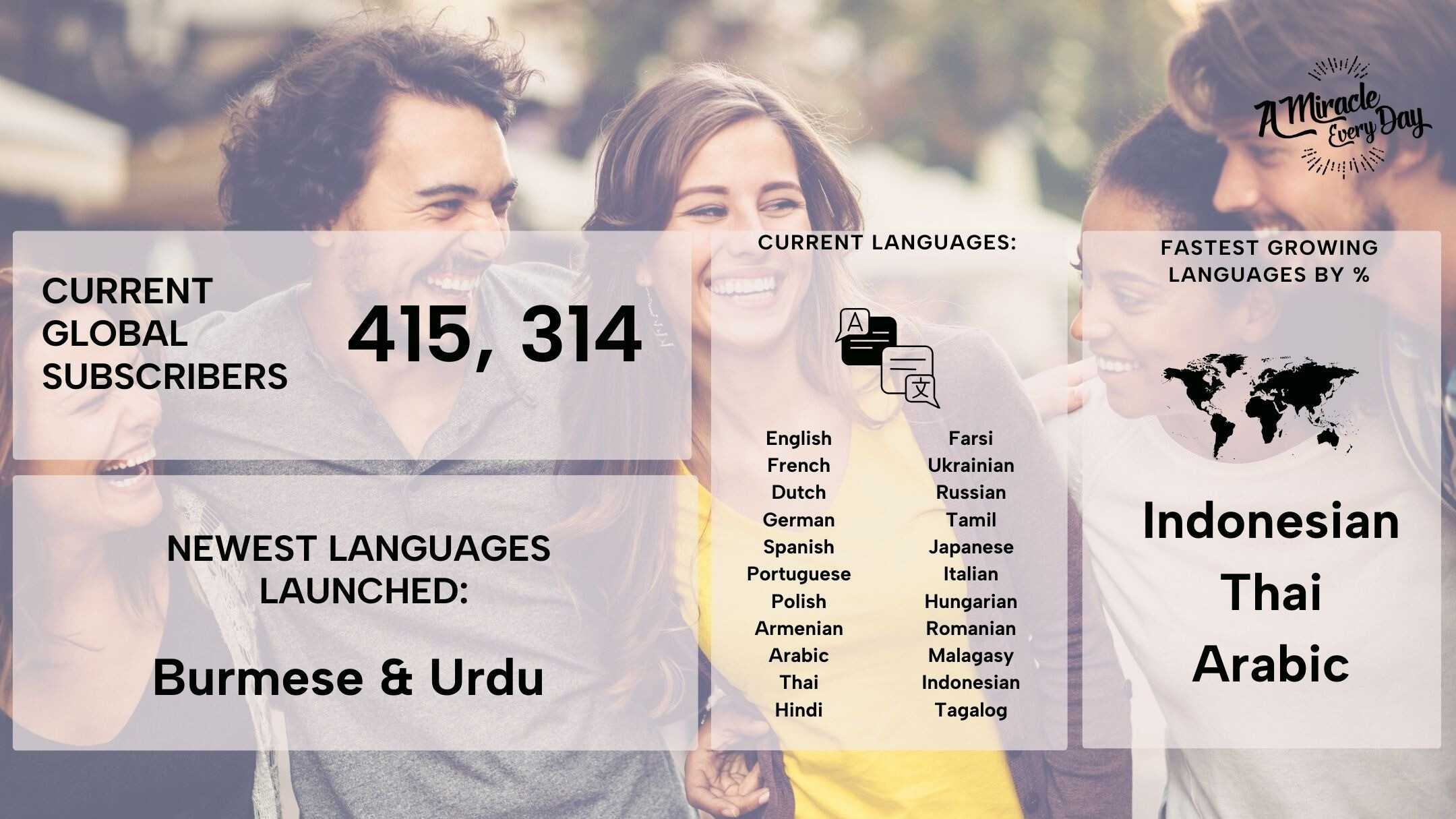 A Miracle Every Day continues to reach across the globe. With your generosity, two new languages have been added this year. The launch of Urdu (Pakistan) has shared the news of Jesus with many in the country. This was only possible because of your generous spirit!