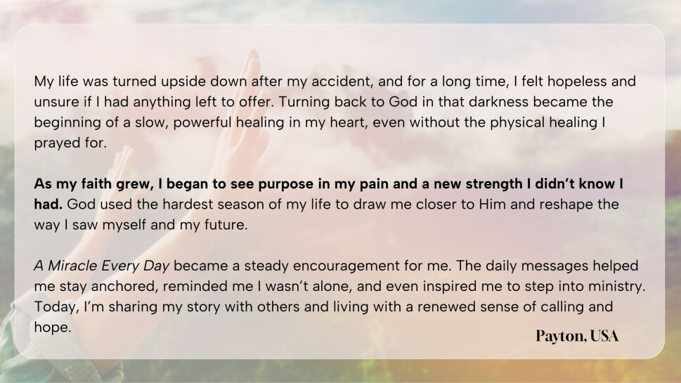 Daily, we receive stories from readers of A Miracle Every Day whose lives are being impacted. These daily emails become an encouragement and a light all over the world!